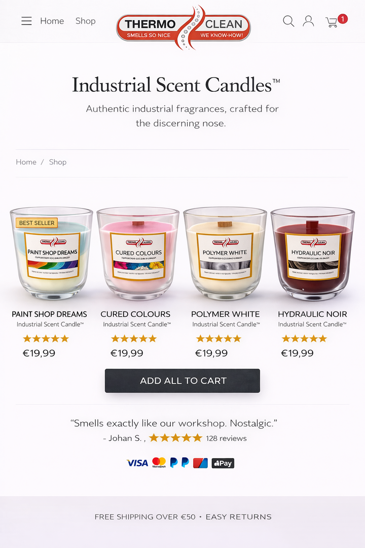 The Thermo-Clean industrial fragrance collection is available as of today through our specialized webshop. For companies looking to offer these products as a gift or as part of a wellbeing initiative for their employees, we provide attractive volume-based discounts tailored to their needs.